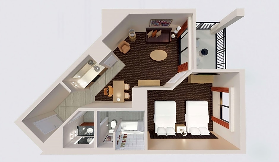 Boasting city views and a 32-inch flat-screen cable TV, this suite also offers a separate living room with a sofa bed and a small refrigerator.