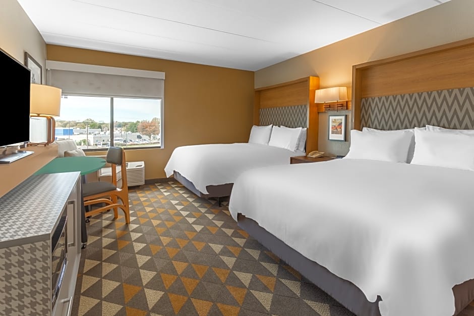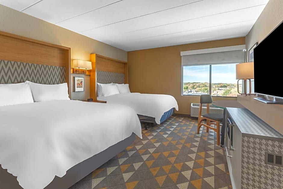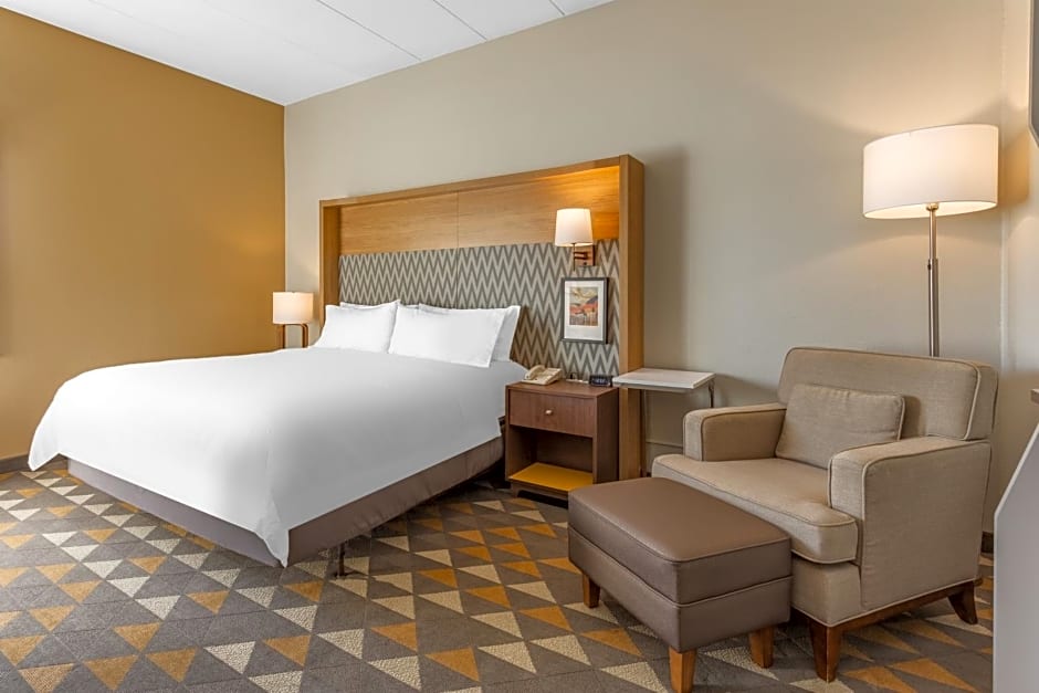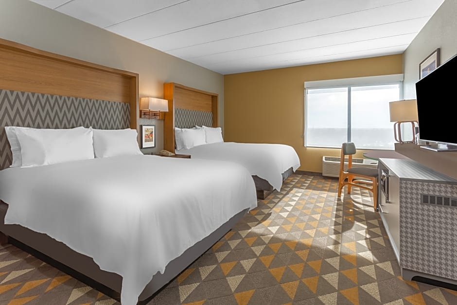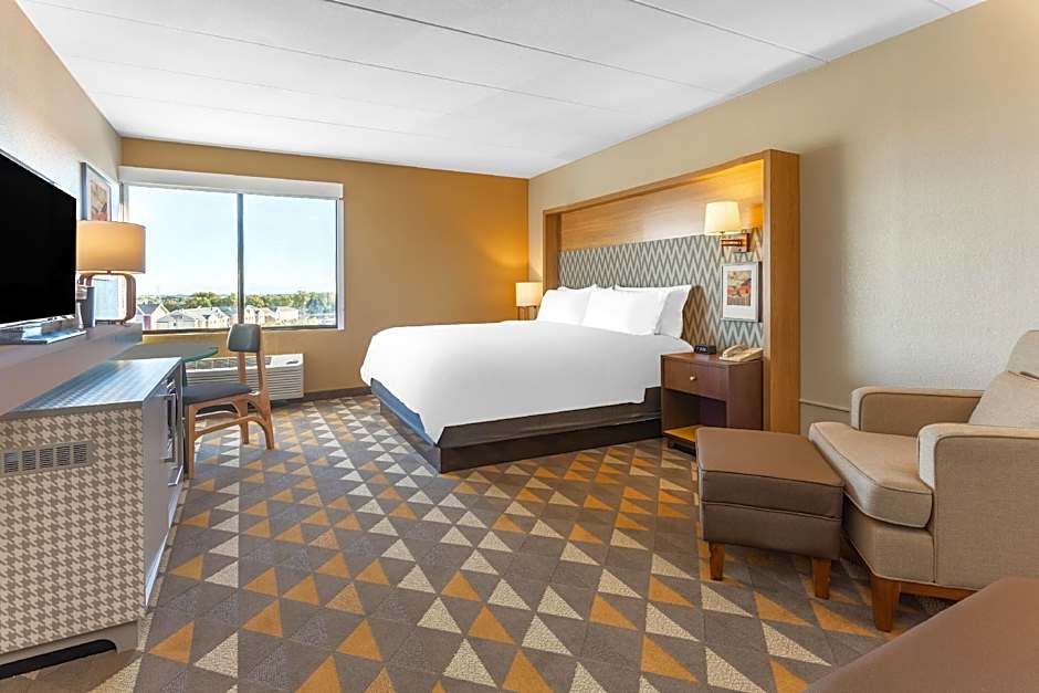 The Holiday Inn Rockford offers a variety of room types including King Rooms, Queen Rooms, Twin Rooms, and Suites. All rooms are non-smoking and have a similar size of 355 sqft, except for some suites which are larger at 495 sqft. The occupancy ranges from 2 adults and 1 child for the regular King Room, to 4 adults and 3 children for the mobility access rooms and suites. Bed sizes include King, Queen, and Twin beds, depending on the room type chosen.