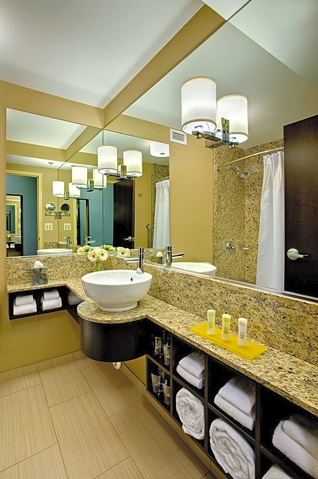 Featuring a separate living room with a sofa bed, this one-bedroom suite also offers views of the city skyline.