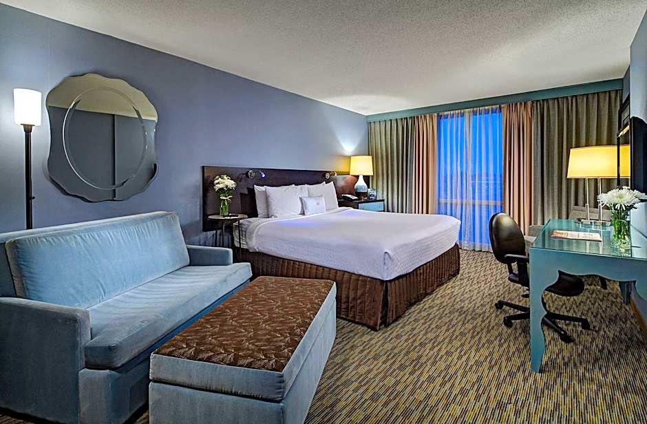 Amenities include a restaurant and bar, an indoor swimming pool, free Wifi, a fitness center, and a 24-hour front desk. The property offers free airport shuttle and free shuttle service, plus private parking and on-site parking with extra charges. Pet-friendly accommodations are available with extra charges, and meeting/banquet facilities, a business center, and live music/performances (extra charges) are offered.