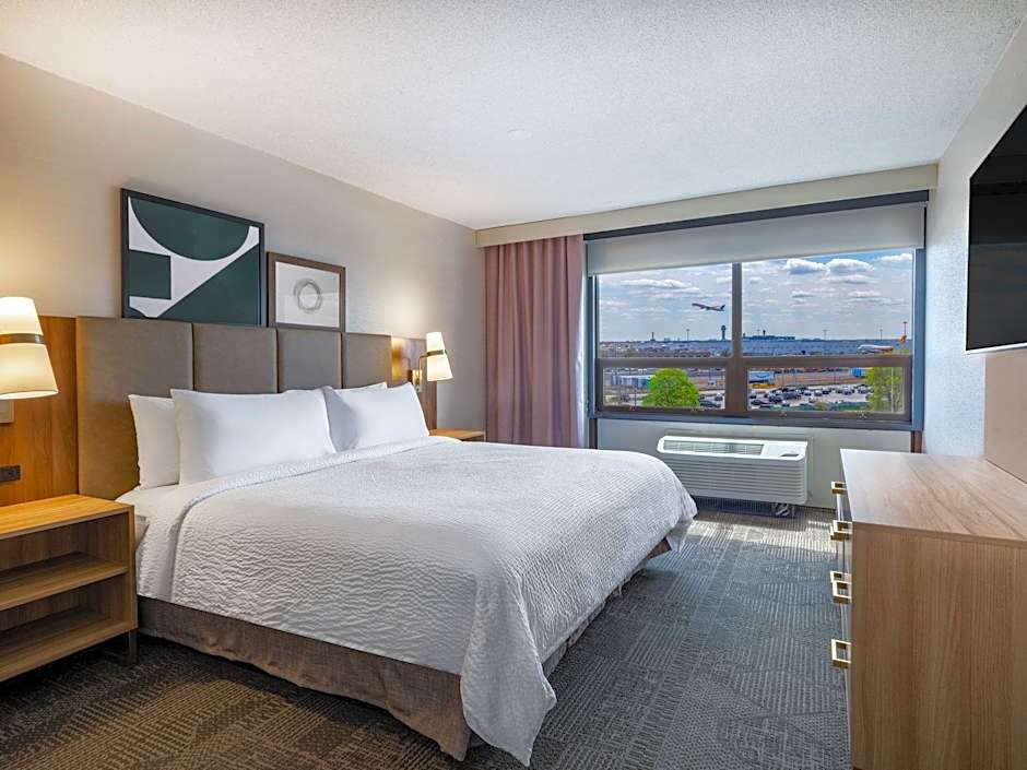 Staybridge Suites Chicago O'Hare - Rosemont offers a variety of suite options for guests. The Studio King Suite and Studio Queen Suite both accommodate 2 adults and 1 child, with bed sizes of King and Queen, respectively. These rooms are not smoking allowed. The One-Bedroom King Suite with Airport View is larger, accommodating 4 adults and 3 children, with a King size bed. Smoking is also not allowed in this suite.