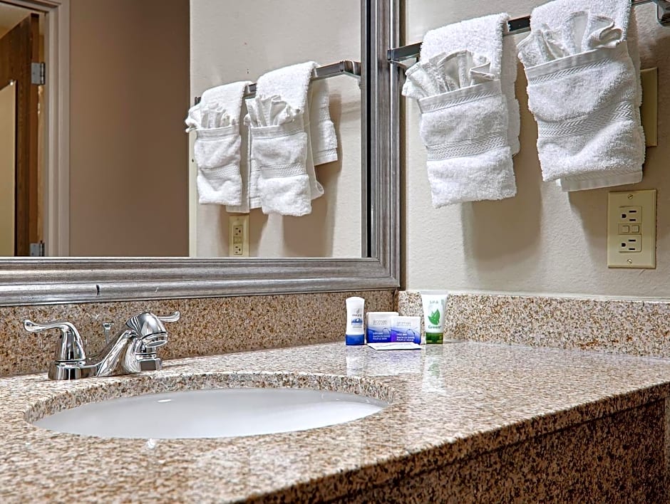 We picked this place for the pool and hot tub. The pool was heated! The hot tub was nice, not super hot though. But that meant I could soak longer without overheating! The bathrooms are a little snug, but the shower water pressure was good! The room was cozy and the beds were comfortable.