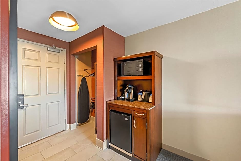 This room includes a flat-screen TV, microwave, and small refrigerator. Seating area is also included.