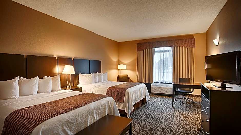 Our two queen smoking mobility accessible room offers communication assistance, grab bars, bench in tub, 32-inch LCD TV, MP3 alarm clock radio, hairdryer, iron/ironing board, four cup coffee maker, free high-speed Internet. Each guest can enjoy a complimentary expanded breakfast that includes: fresh fruit, eggs, bread selections, yogurt, cereal, waffles, coffee/tea, milk and juice.