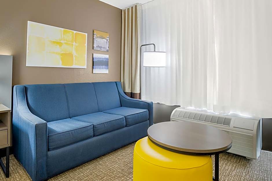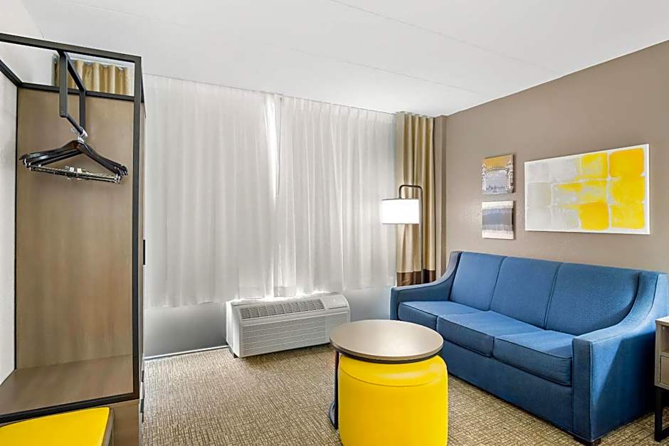 This room features a microwave, refrigerator and sofa bed.