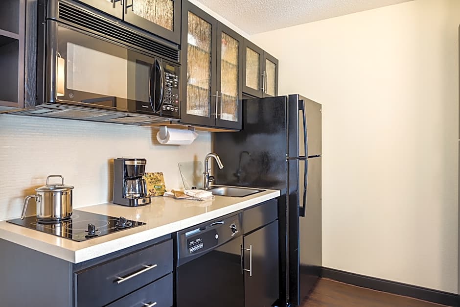 This suite is subject to availability and is selected upon arrival. It features a kitchen with a full-size refrigerator, microwave, dishwasher and two-burner stove top.