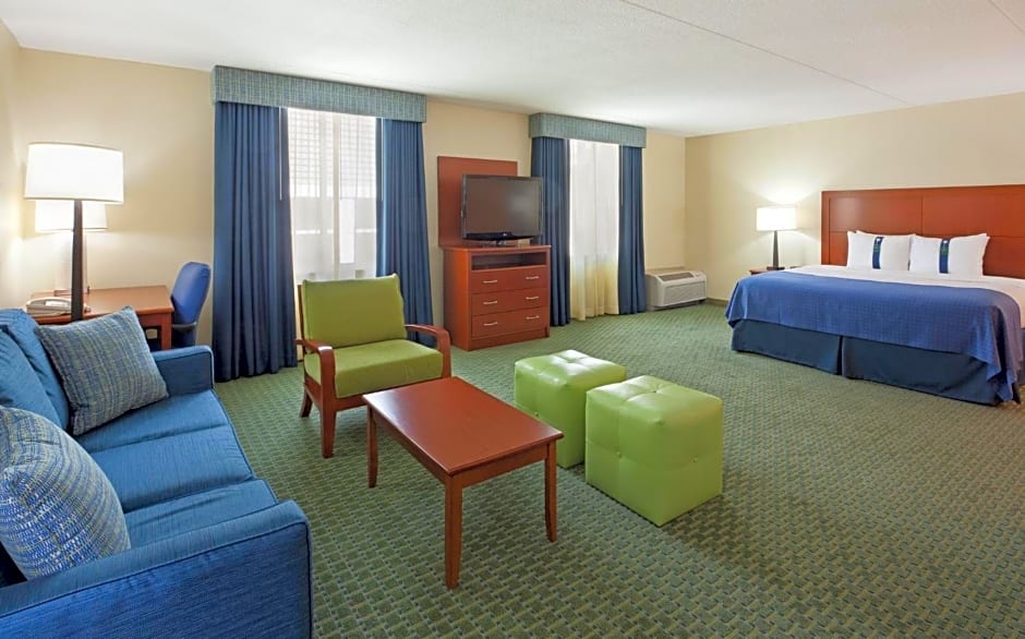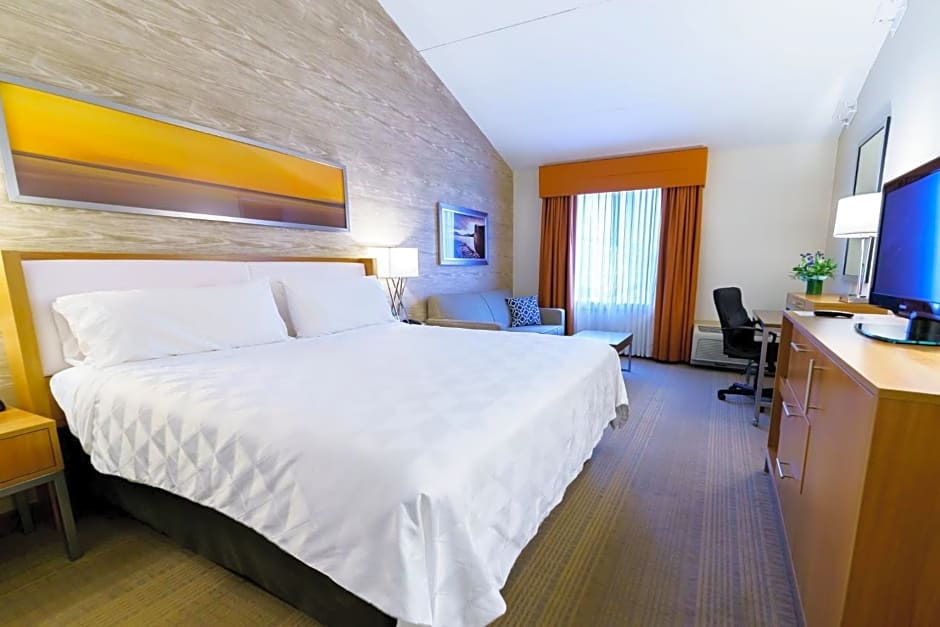 This accessible room features a roll-in shower, flat-screen TV, and seating area.