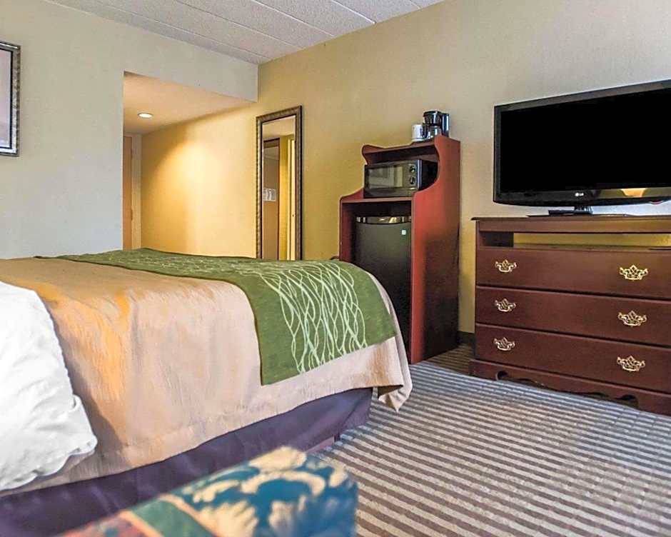 This room features one king bed, cable TV, and a refrigerator.