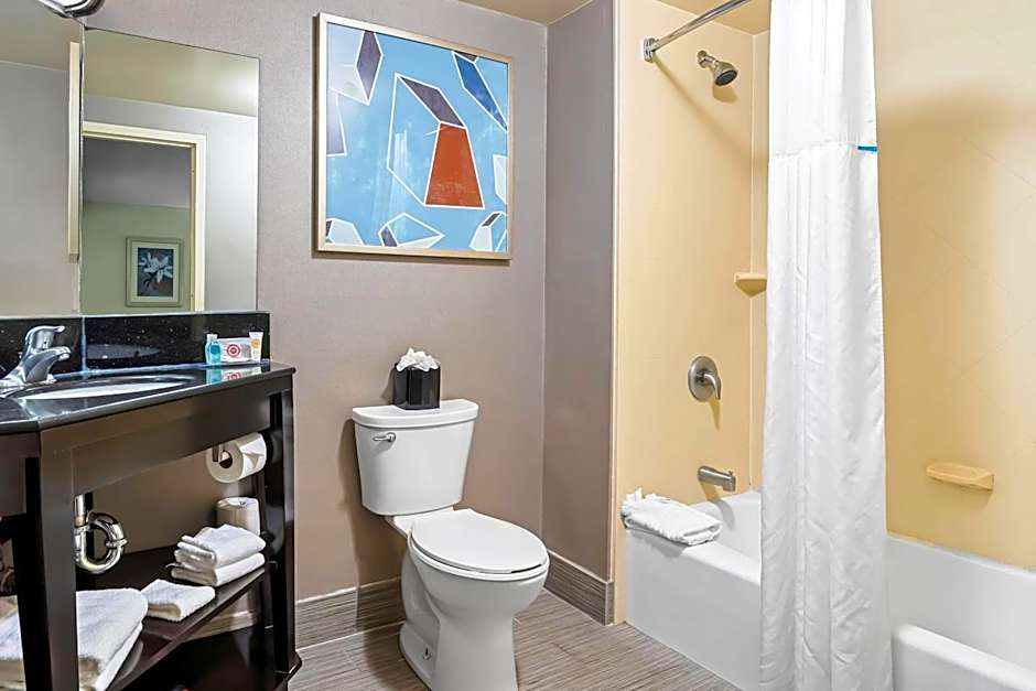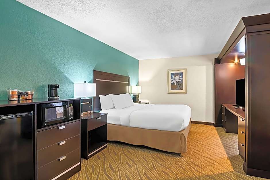 Sofa bed, 32-inch HDTV, work space, microwave, refrigerator, free WiFi Enjoy extra space and comfort in this studio suite which offers one king-sized clean and fresh Hampton bed®, a 32-inch HDTV and a comfortable sofa bed to sleep an extra guest. Work in comfort at the large desk and stay connected with free WiFi access. Refresh in the bathroom, complete with a large dressing area, WaterPik showerhead and fluffy towels. The curved shower rod provides extra space and light when showering. Additional amenities in this room include a handy coffee/tea maker, microwave and refrigerator.