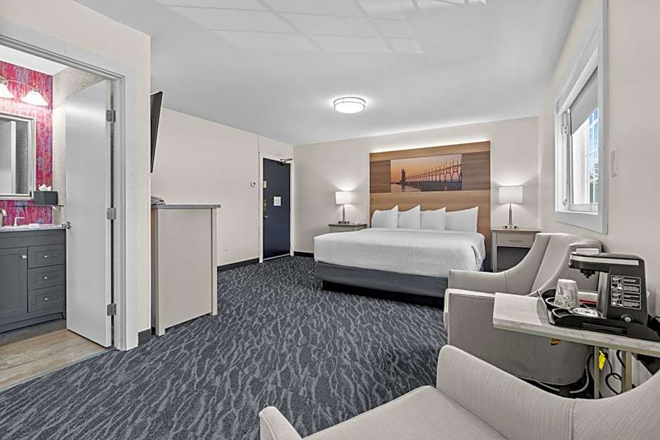 This double room features a seating area, and sofa. It features a direct walk out to East Grand Traverse Bay.