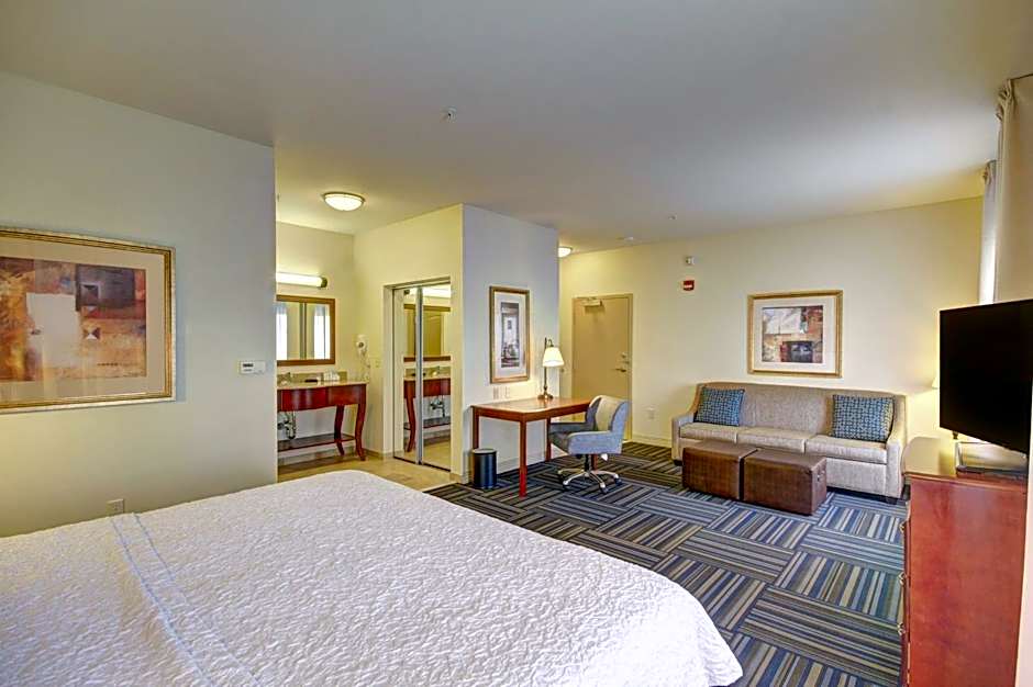 The Hampton Inn and Suites Alexandria offers a variety of room types including King Studio with Sofa Bed, King Room, Queen Room with Two Queen Beds (including one with disability access), and King Room with Sofa Bed. All rooms are non-smoking and have different occupancy capacities ranging from triple to quadruple. The rooms feature various bed sizes including King size beds and Queen size beds, with some rooms also offering sofa beds for additional sleeping arrangements.