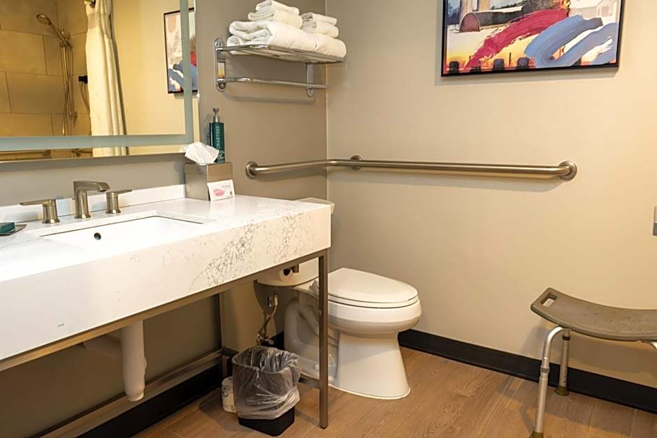 Located close to the hotel entrance, this accessible room features a raised toilet and handheld shower head. Free Wi-Fi and cable TV are provided.