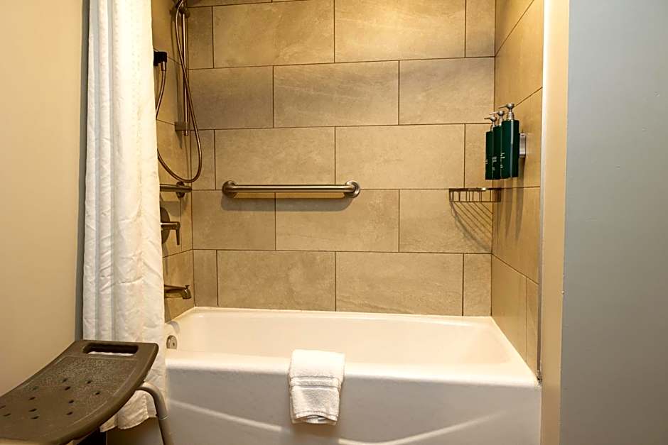 Featuring cable TV, this accessible room also offers a microwave and fridge. The bathroom includes a handheld showerhead and raised toilet.