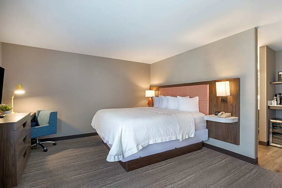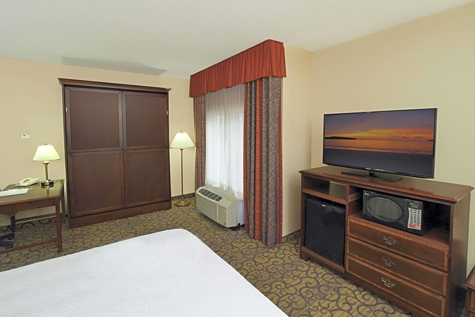 Pull-down bed, 46-inch HD TV, work desk, microwave, refrigerator, coffeemaker, free WiFi Enjoy a restful stay in this comfortable room with a king-sized clean and fresh Hampton bed® plus a pull-down queen bed, an easy chair and a 46-inch TV with HD channels. This room also features a large work desk, a microwave, mini-refrigerator and a coffeemaker. Free WiFi access will help you to stay connected when on the road. The bathroom contains plush towels and a shower featuring a curved shower rod for added space and light.