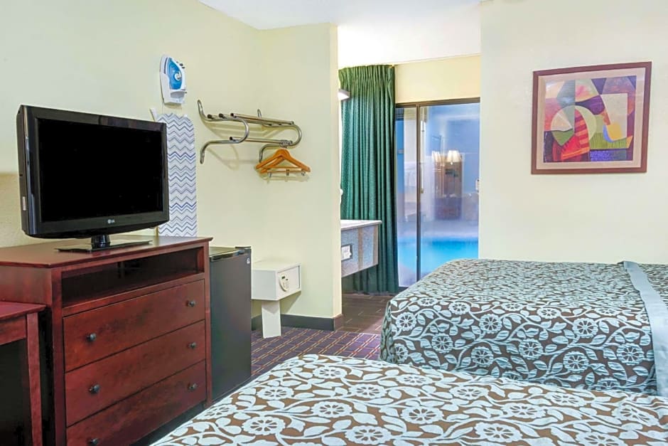 Rooms at Days Inn by Wyndham Albuquerque West include King Rooms with a disability access option, Twin Rooms with 2 Queen Beds and a pool view, and Queen Rooms with Two Queen Beds available in smoking and non-smoking options. Occupancy ranges from 2 adults and 1 child to 5 adults and 4 children. Bed sizes vary between Queen and King, with some rooms offering additional sofa beds. Smoking is not allowed in any of the rooms.