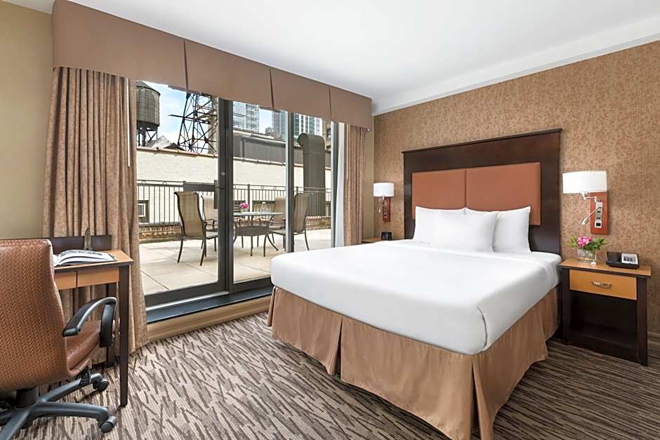 The Empire Room offers views of the Empire State Building, has a private deck of 210 square feet space and a patio table with 4 chairs on the deck. The deck is lit by 2 sconces.