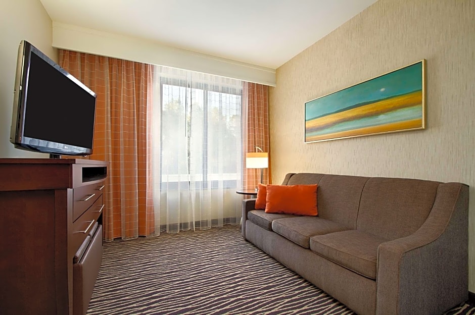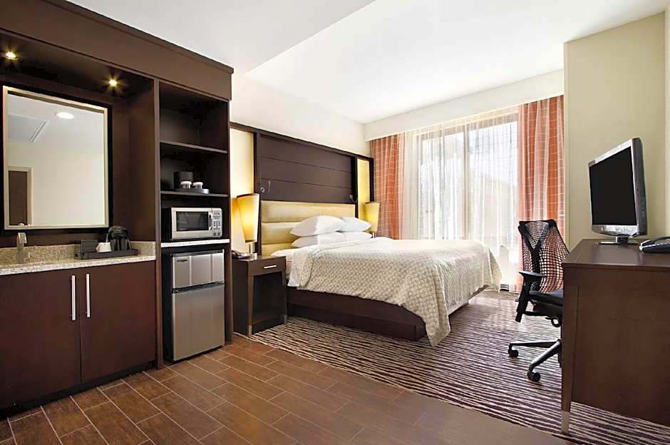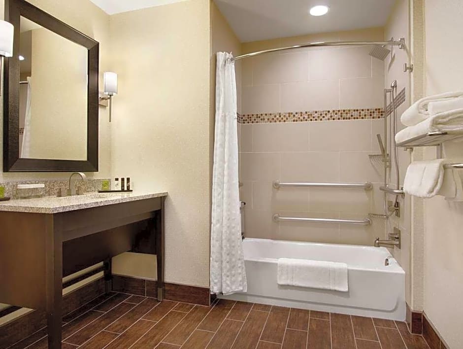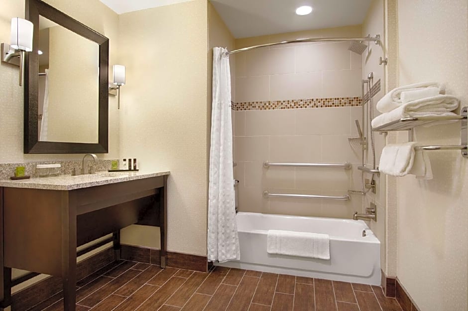 Enjoy this spacious and warmly decorated two-room suite offering a separate bedroom and living room in a modern transitional style with all of the comforts of home. The living room features a granite-top wet bar with mini-refrigerator and microwave, a flexible work area with multi-task desk/table with ergonomic chair, wired and WiFi access, a "stretch out and relax" living area with sofa bed and 42-inch flat-screen HDTV. The bedroom features our "Presidential Suite Plush" king-sized bed topped with Embassy Essentials high thread count bedding, alarm clock with MP3 plug-in, with a second 42-inch flat-screen HDTV and opens to a spacious bathroom with granite-top vanity and trend setting designed sink arranged with invigorating bath amenities. Bring on the morning with our complimentary cooked-to-order breakfast and be prepared to unwind and relax at our Evening Reception. Any corresponding photo may not reflect the specific accessible room type or room feature.
