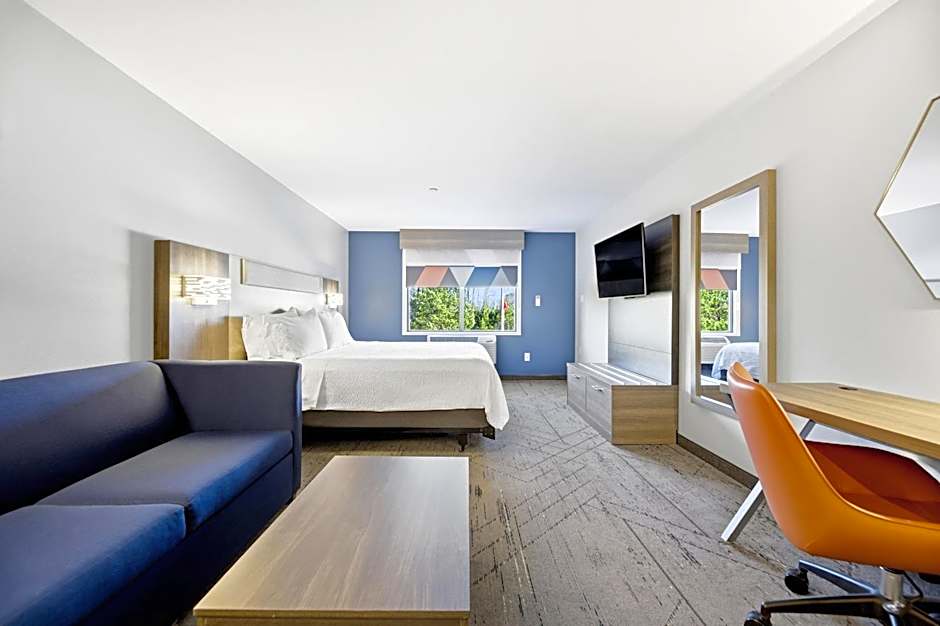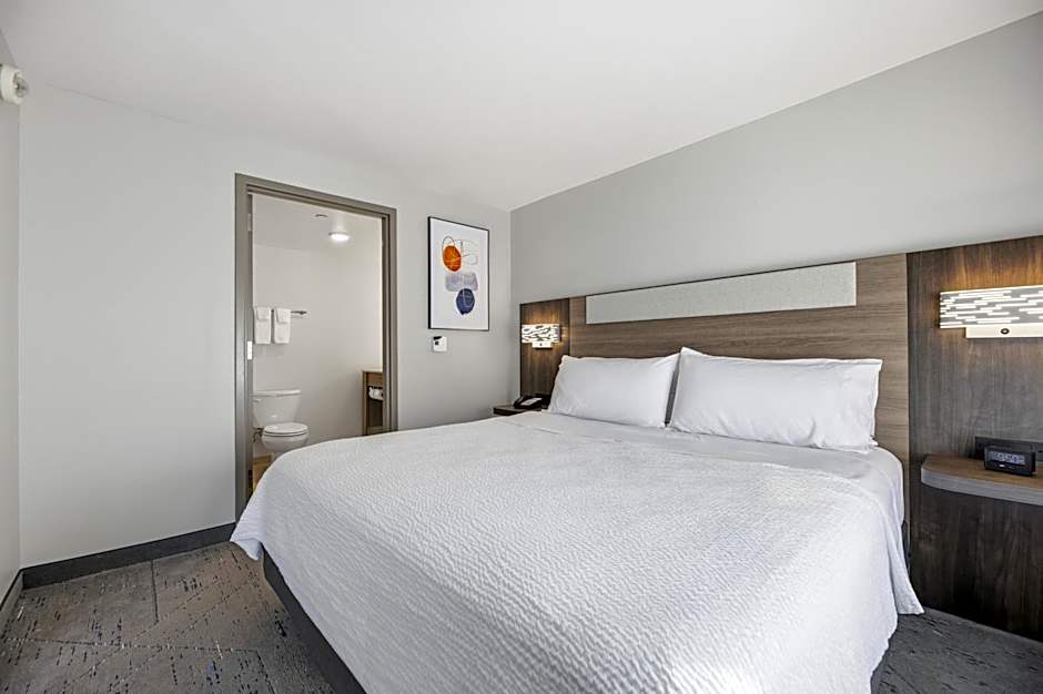 Stretch out and relax in our spacious King Studio Suite, designed with comfort and convenience in mind. This open-concept suite features a cozy seating area with a sofa, a dedicated bedroom area with a plush king-size bed, and a dining table perfect for meals or work. The wet bar is equipped with a microwave, mini-refrigerator, sink, and coffee maker, making in-room snacks and refreshments a breeze.
