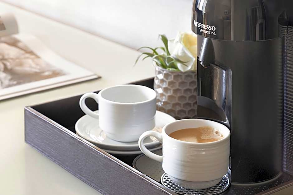 The room has a flat-screen TV, work desk, and coffee machine.
