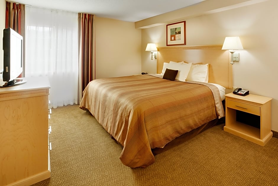 The hotel offers a variety of rooms including Queen Rooms with Accessible Roll In Shower, Suites, Queen Studios with Two Queen Beds, Studio Suites with One Queen Bed and Access Transfer Shower, Queen Studio Suites with Mobility Access Roll in Shower, One-Bedroom Suites with Sofa Bed, and Queen Studios. All rooms are non-smoking. The rooms accommodate different numbers of adults and children, ranging from 2 adults and 1 child to 4 adults and 3 children. Bed sizes include Queen and King, with some rooms also offering a sofa bed.
