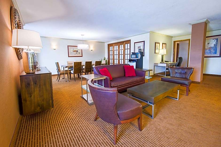 A separate living area, a dining area and a separate bedroom with king bed distinguishes this room.