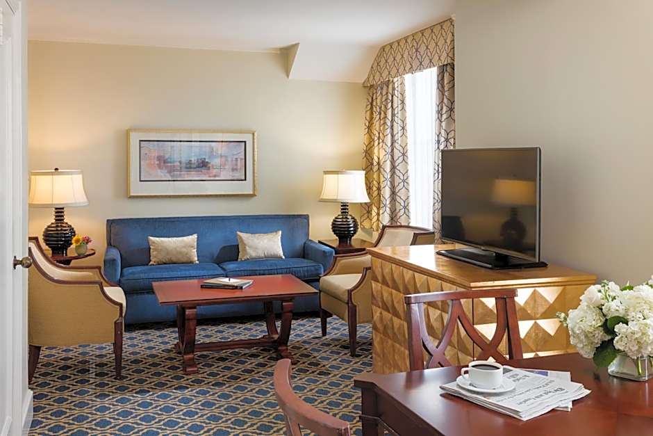 This corner suite features a European-style master bedroom, separate seating area, and a sofa bed. A view of Charleston rooftops and an en suite also with marble and granite accents are also included.