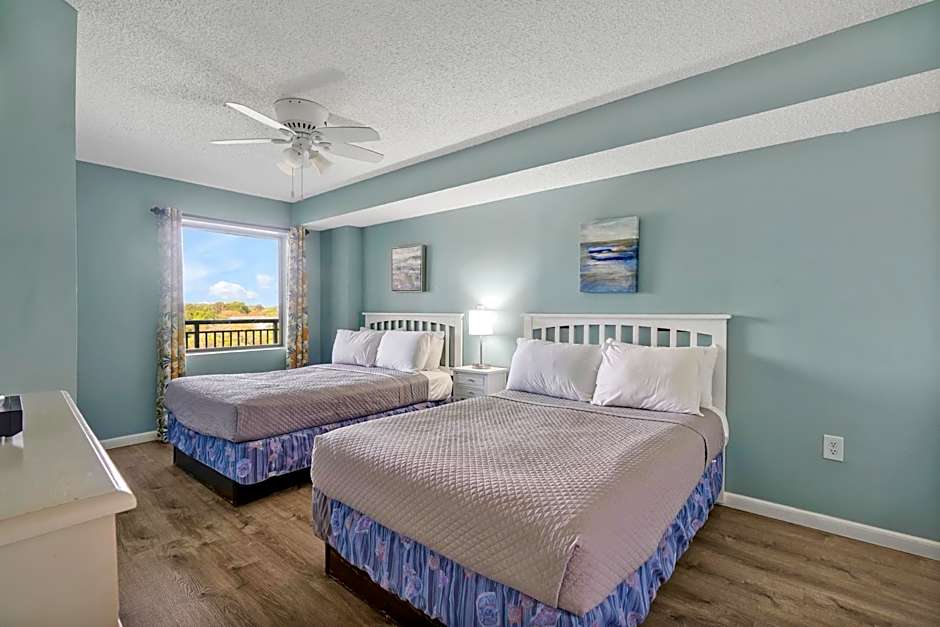 The Sand Dunes Resort & Suites offers a variety of rooms, including Two-Bedroom Suites, Three-Bedroom Suites, One-Bedroom Suites, Standard Oceanview Rooms, Standard Oceanfront Rooms, and Waterpark View 1 Bedroom Suites with a kitchenette. All rooms have a non-smoking policy. The suites range in size from 549 sqft to 1195 sqft and accommodate a maximum of 12 adults and 2 children. The bed options for the rooms are either 2 double beds or 4 double beds.