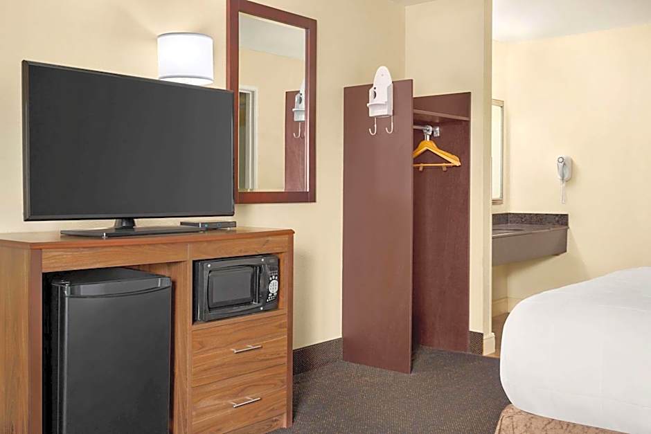 This accessible room features accessible amenities, including an adapted bathroom with safety grab bars. The room is equipped with a flat-screen TV, microwave and refrigerator. Complimentary toiletries and towels are provided in the bathroom. A coffee-maker is included.
