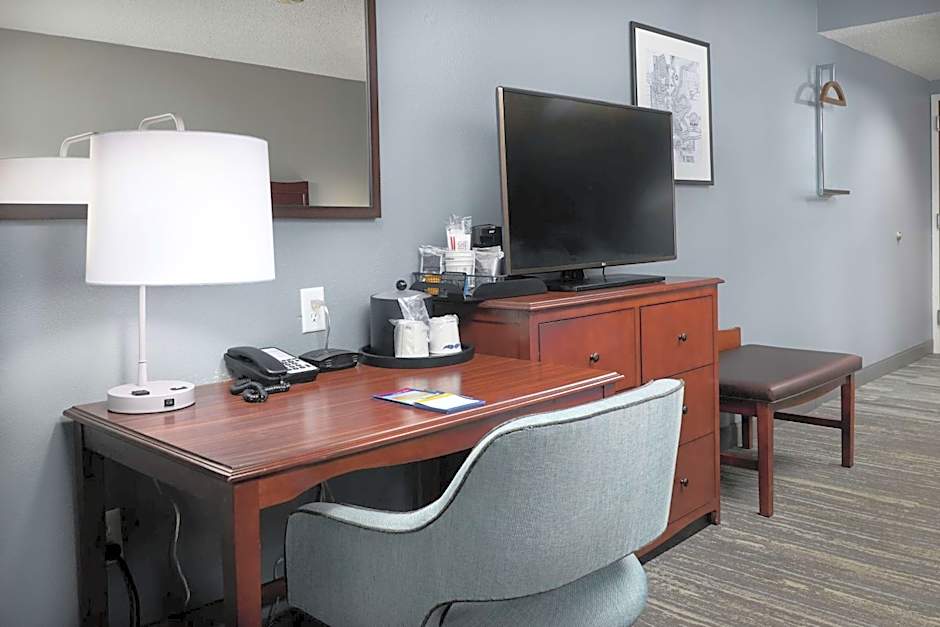 Work area, free WiFi, 32-inch HDTV, tea/coffeemaker, easy chair with ottoman Have a relaxing stay in this king room that features our clean and fresh Hampton bed®. Unwind in the easy chair with ottoman while watching the 32-inch HDTV. Enjoy a delicious hot drink from your in-room tea/coffeemaker. The room includes a spacious work desk and free WiFi to let you catch up on work while traveling. In the bathroom you'll enjoy fluffy towels, a WaterPik® showerhead and curved shower rod for added space and light. Please call the hotel for more details.