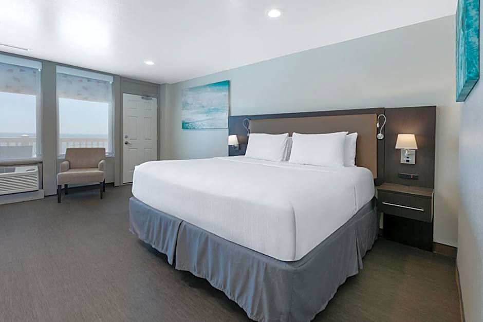 The types of rooms available at Wyndham Corpus Christi Resort North Padre Island include King Rooms with either a roll-in shower or a bathtub, King Suites with city view or ocean view, Suites with two Queen beds and ocean view or city view, and a Family Suite with two King beds and ocean view. Smoking is not allowed in any of the rooms. The rooms can accommodate various numbers of adults, ranging from 2 to 5 adults, and have bed sizes of either King or Queen.