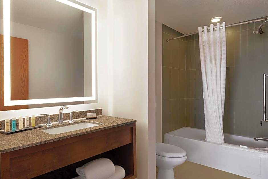 A TV with access to cable and satellite channels is included in this suite. It also provides a microwave and refrigerator. A larger tub is featured for accessibility.