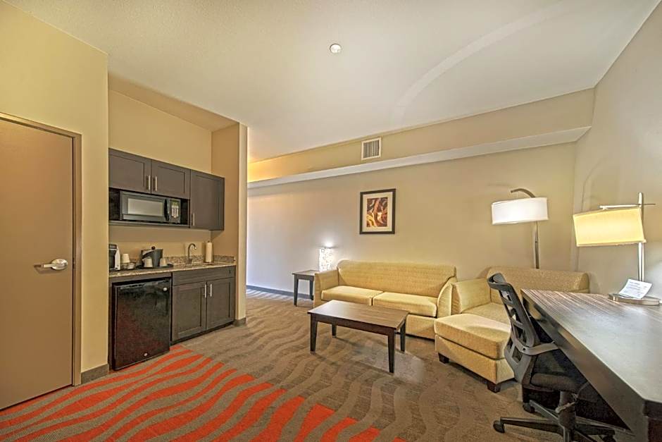 This spacious suite features a separate living area, 37-inch flat-screen TV, refrigerator, and microwave.