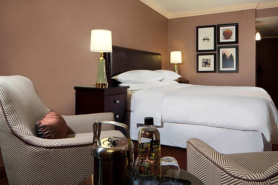 The Sheraton DFW Airport Hotel offers a variety of room types including King Rooms with Adapted Tubs and Roll-in Showers for mobility accessibility. All rooms have a double occupancy and can accommodate an additional child. Smoking is not allowed in any of the rooms. The bed sizes in the rooms are either a King size bed or a combination of a King size bed and a sofa bed.