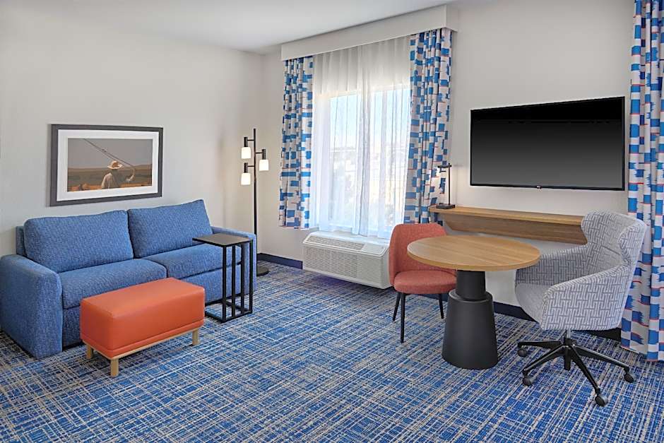 Room has a seating area and a work desk.