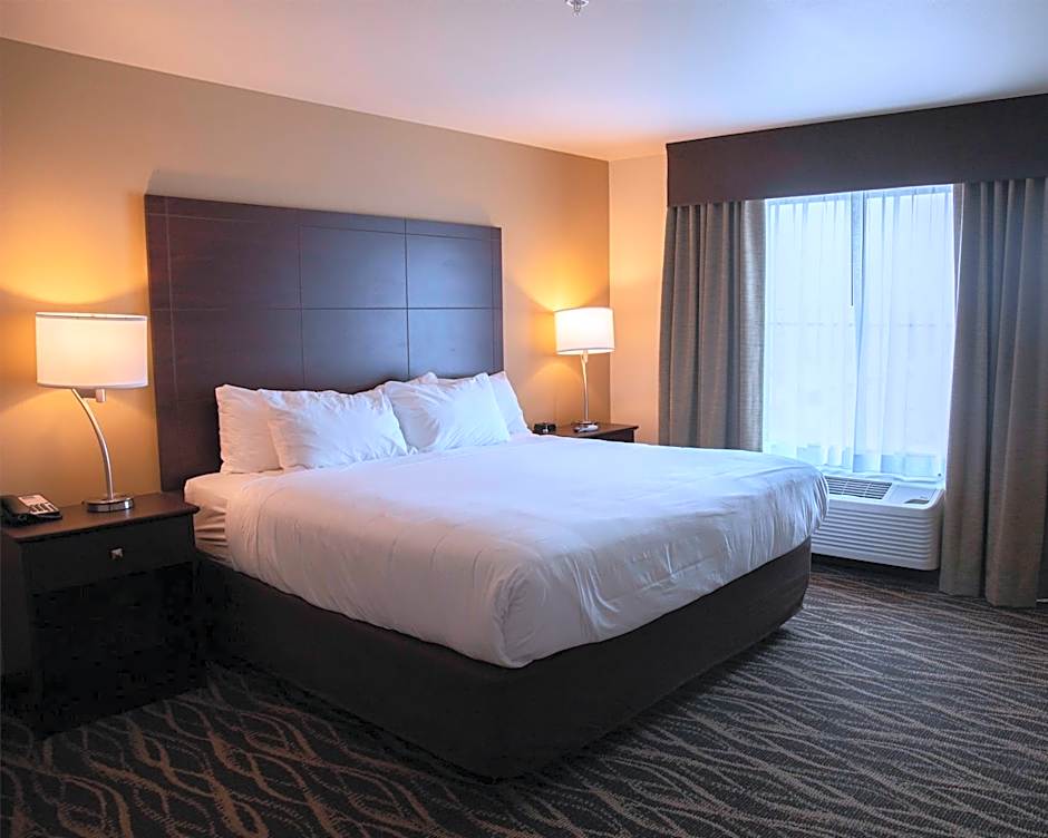 Accommodations range from Standard Rooms to Studio Suites and larger Suites, plus King Rooms. The on-site bar offers a casual place to unwind after a day of exploring. The heated indoor pool provides a relaxing retreat, and a fitness center helps stay active. A business center is available for work on the go.