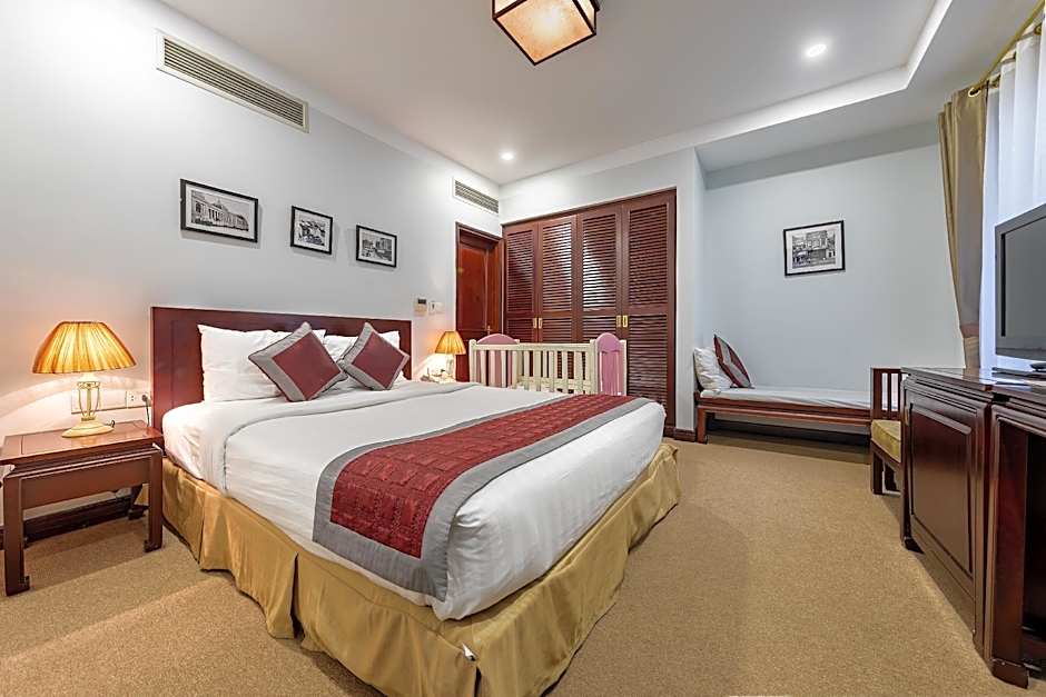Spacious, air-conditioned suite features a private balcony offering views of Hanoi's Old Quarter and a seating area. Also includes a flat-screen satellite TV, safe and tea/coffee making facilities. The bathroom is fitted with a bathtub and a hairdryer.