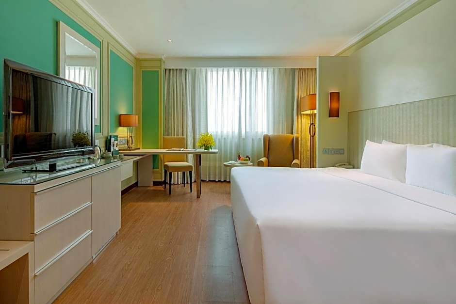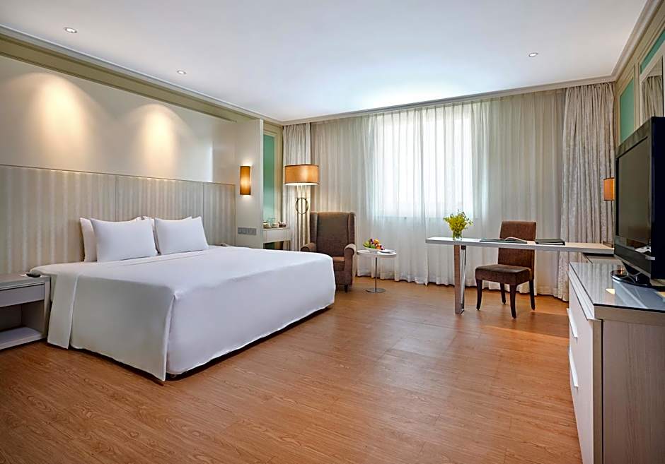 This spacious fully carpeted room features air conditioning and is equipped with a work station and double sofa chairs. A fully stocked mini-bar and tea and coffee station are provided. A wide selection of international TV channels are available on the 32-inch LCD TV.