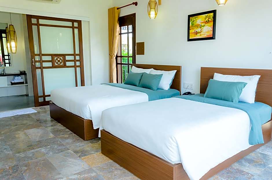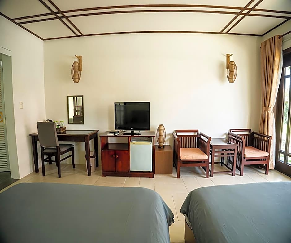 The Riverside Bamboo Resort Hoi An offers twin rooms with lake view, pool view, and garden view. These rooms have a size of 538 sqft and can accommodate 2 adults with no children. The beds in these rooms are either 2 queen size beds or 1 queen size bed. Smoking is not allowed in any of these rooms.