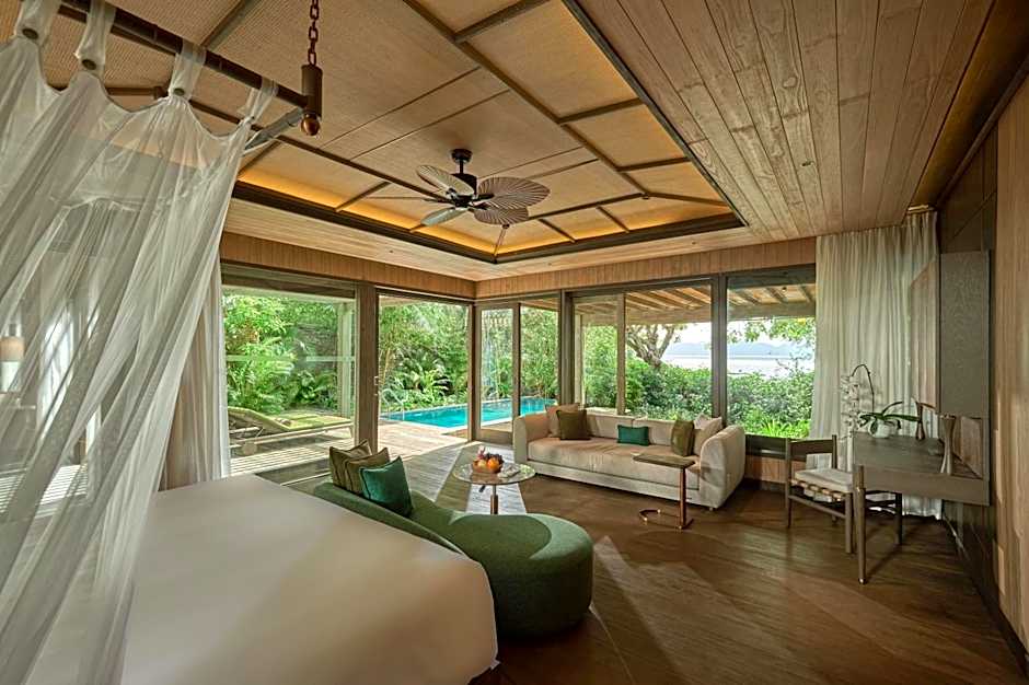 As acomodações abrangem uma variedade de vilas e quartos, incluindo a Duplex Villa (Bay View); a Beachfront Pool Villa; e a Three-Bedroom Beachfront Pool Villa, entre outras, como a Villa with Private Pool e várias opções com vista para o oceano. As formas de pagamento incluem dinheiro e os principais cartões: JCB, Mastercard, Visa e American Express.